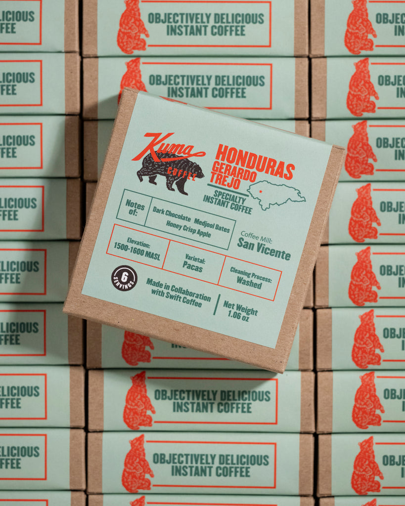Many have asked for a coffee they can take on the road, brew quick by just adding water, enjoy on the go. The day has come: Kuma instant coffee! We partnered with one of our favorite Honduran producers, Gerardo Trejo, and worked with our friends at Swift Coffee to transform it into soluble coffee crystals.
